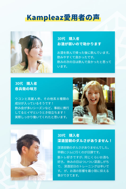 Kampleaz〈カンプリーズ〉は、100%天然成分由来のお酒を飲む人のケアサプリです。毎日のお酒で疲れている体を優しくサポート。原材料は、グルタチオン酵母エキス、高麗人参酵素、ウコンなど8種類の成分を含んでおり、飲む人のための強い味方です。飲む前や飲んだ後に1回3〜4粒を摂取してください。